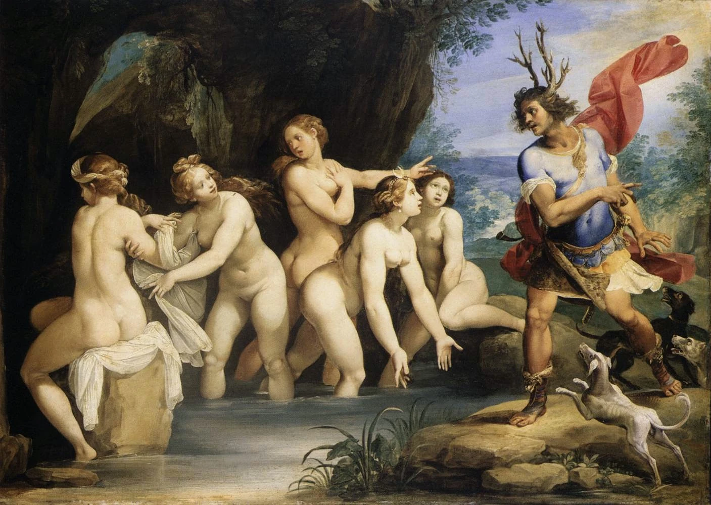 Aktaion, was the son of the minor god Aristaeus (son of Apollo and the nymph Kyrene) and Autonoƫ (daughter of Kadmos, the founder of Thebes in Boeotia); he was a Boeotian hero and hunter. Aktaeon accidentally saw Artemis (goddess of wild animals, vegetation, and childbirth) while she was bathing on Mount Kithaeron.