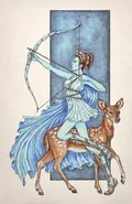 In the classical period of Greek mythology, Artemis was often described as the moon goddess with Leto passing the role onto her, she is also depicted as the twin sister of Apollo. She was the Hellenic goddess of the hunt, wild animals, wilderness, childbirth, virginity and protector of young girls, bringing and relieving disease in women; she often depicted as a huntress carrying a Bow & Arrows. The deer, wolves, and the cypress were sacred to her. In later Hellenistic times, she also assumed the ancient role of Eileithyia in aiding childbirth.