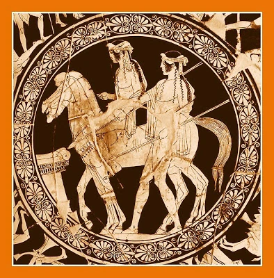 The Dioskouroi twins (only one shown in this image) seize the maidens Leukippides, carrying them off by force to be their brides.