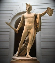 Perseus (Greek: Περσεύς), the legendary founder of Mycenae and of the Perseid dynasty of Danaans, was the first hero. Perseus beheaded the Gorgon Medusa and saved Andromeda from the sea monster Cetus. Perseus was the son of the mortal Danaë and the god Zeus. He was also the great grandfather of Herakles, also a son of Zeus.