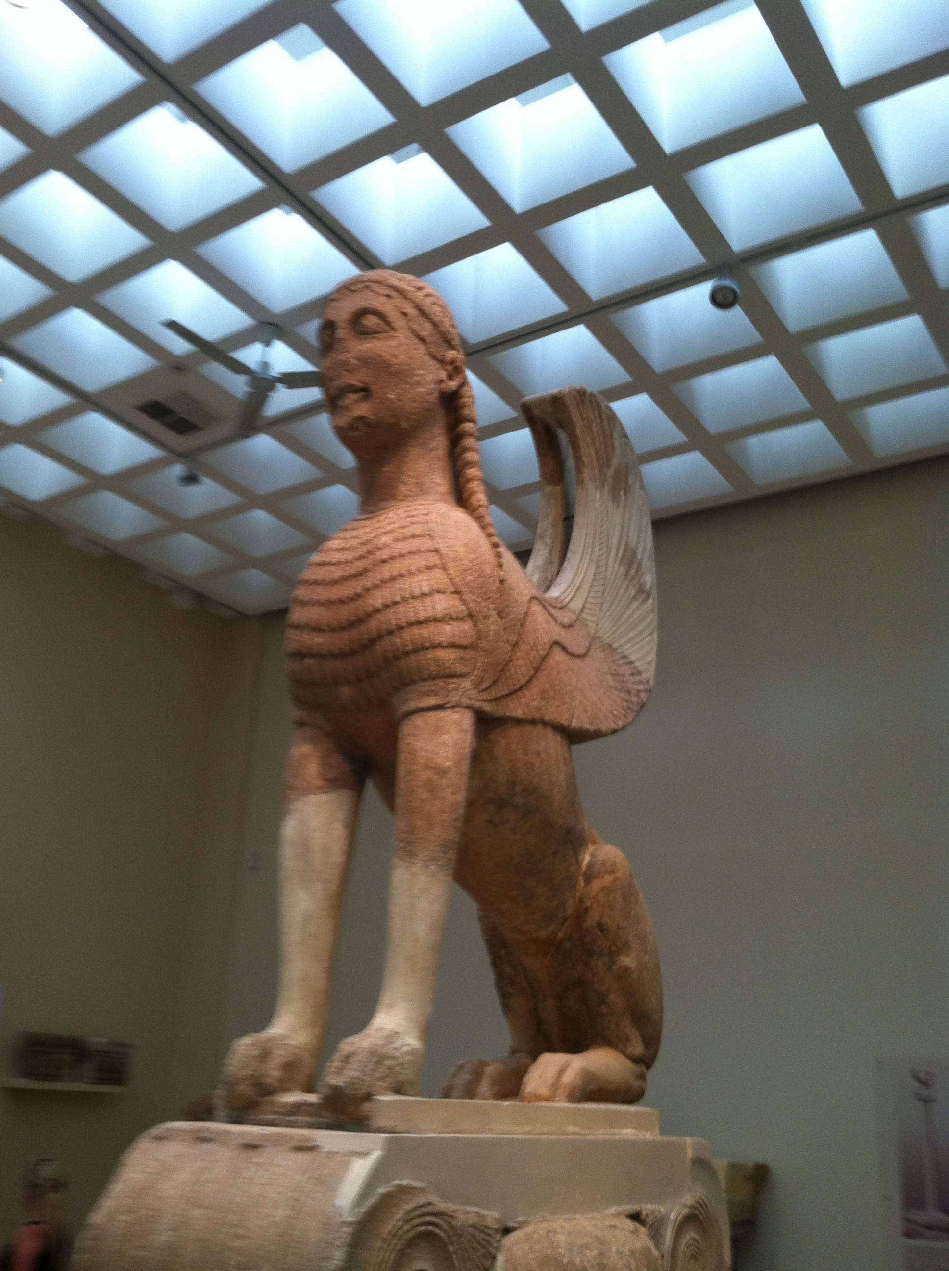 The Sphinx was a creature from ancient Greek mythology. She had the body of a lion and head of a person. She posed a riddle to those who past by her and if they could not answer correctly, she killed them. Oidipous solved the riddle and so she threw herself off a cliff and died.