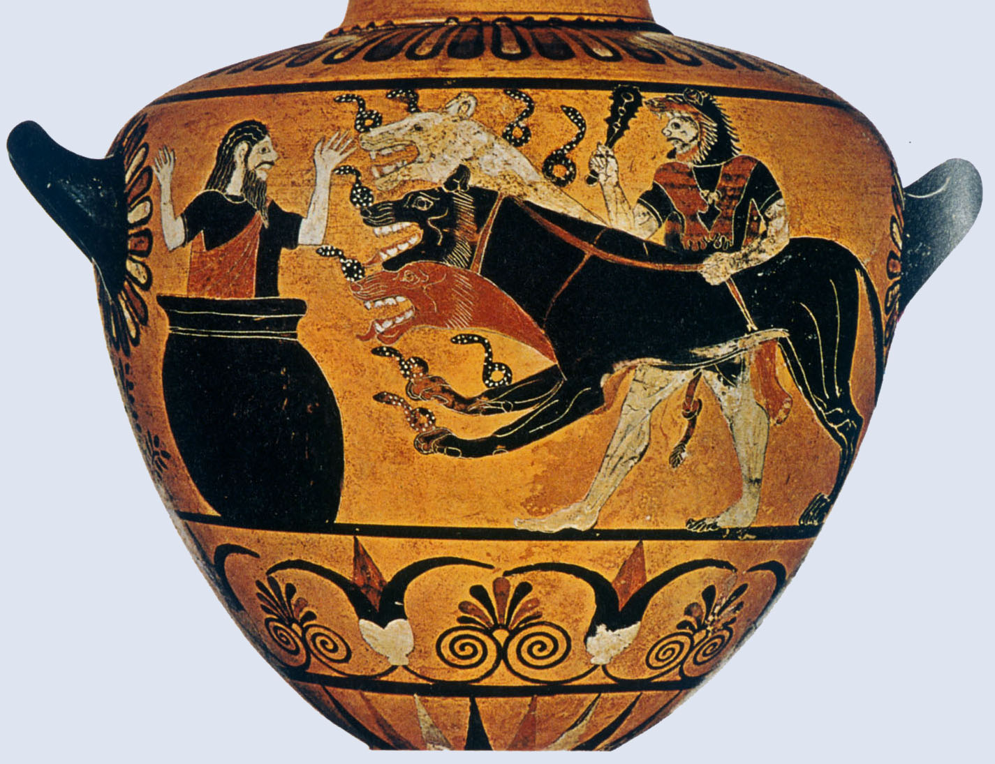 Capturing Kerberos alive, without using weapons, was the final labour assigned to Heracles (Hercules) by King Eurystheus, in recompense for the killing of his own children by Megara after he was driven insane by Hera, and therefore was the most dangerous and difficult. In the traditional version, Heracles would not have been required to capture Cerberus, however Eurystheus discounted the completion of two of the tasks as Heracles had received assistance.