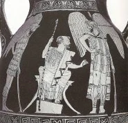 The Harpyia is depicted as a grotesquely, ugly winged woman dressed in a short maiden skirt. The Boread who pursues her is a handsome youth armed with spear and sword. Zethes is a son of Boreas the God of the North Wind. Along with his brothers Kalais, they are known as the Boreads. Zethes and Kalais were Argonauts and are identifiable because of their wings.
